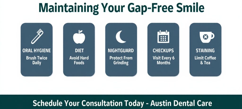 Porcelain veneers can last 10-15 years with proper care. Their durability and stain resistance make them a long-term solution for closing gaps and maintaining a beautiful, natural-looking smile with minimal upkeep.