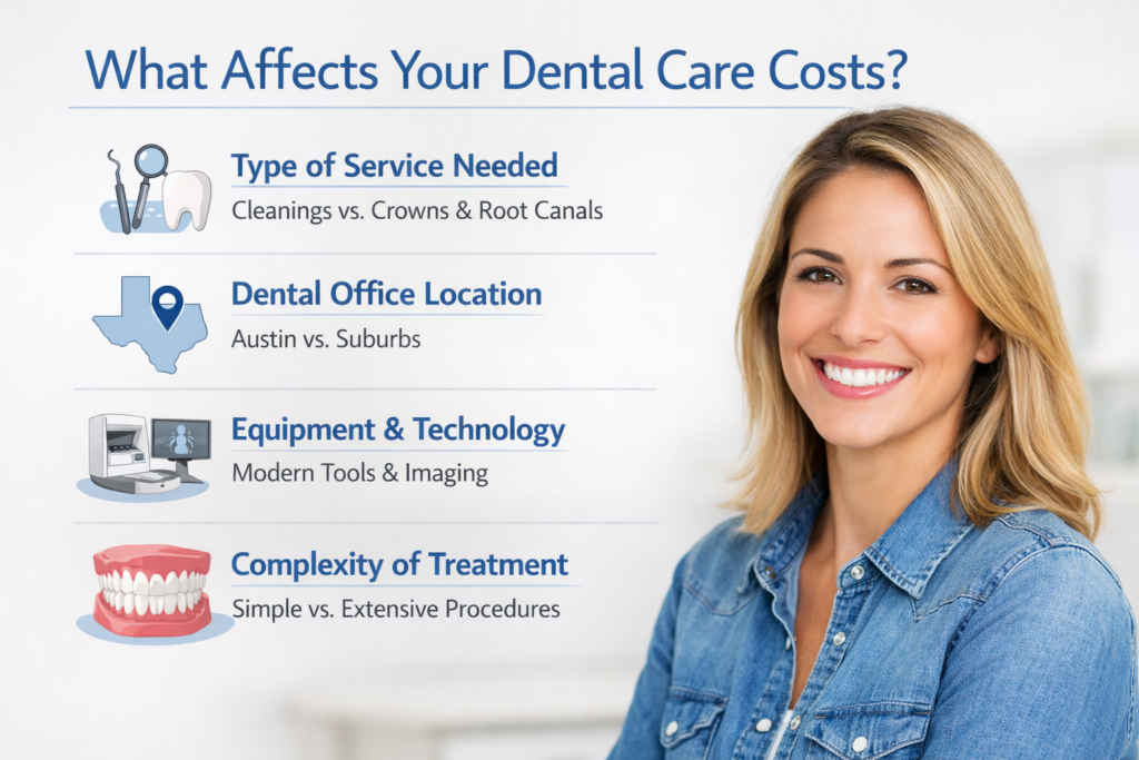 - Dental Office Location: Practices in central Austin neighborhoods may have slightly different rates compared to suburban areas.